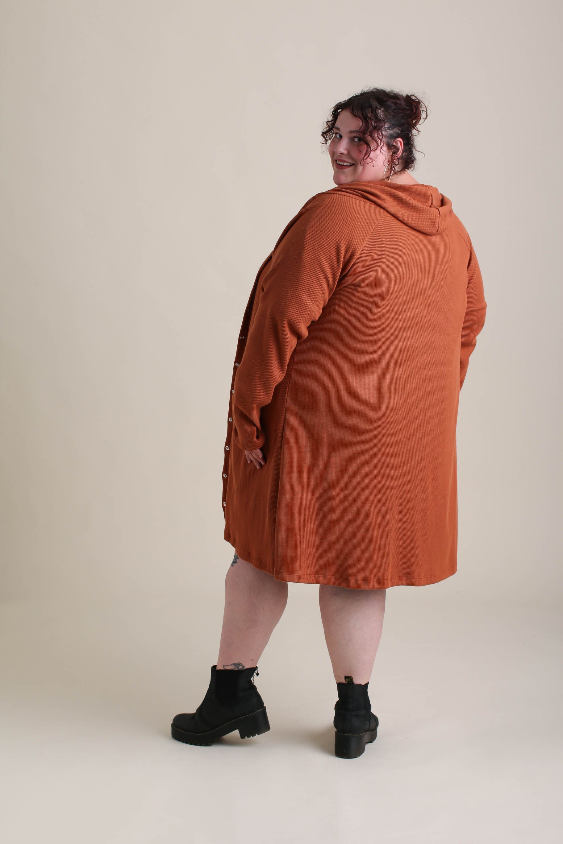 Made from 100% organic cotton waffle-knit thermal fabric, the Atlas Cardigan is soft, breathable, and perfect for staying cozy. This shorter version of our Compass Cardigan features raglan-style long sleeves, ring snaps from collar to knee, and a hood for extra warmth and style. Whether layered or worn on its own, this versatile piece is handcrafted in Michigan, USA for a truly special touch.