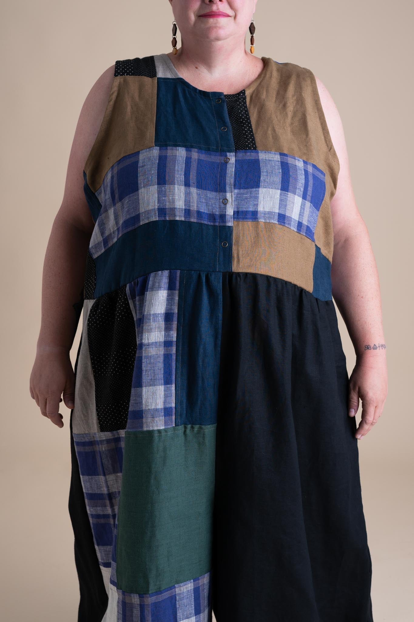 Crafted from cotton and linen fabric scraps, the Patchwork Backyard Jumpsuit is as unique as it is comfortable. With flowing cropped pants, a convertible design (wear snaps in front or back), and convenient inside pockets, this one-of-a-kind piece offers both style and practicality. A true statement in sustainable fashion, it's a conversation starter and a wardrobe essential.