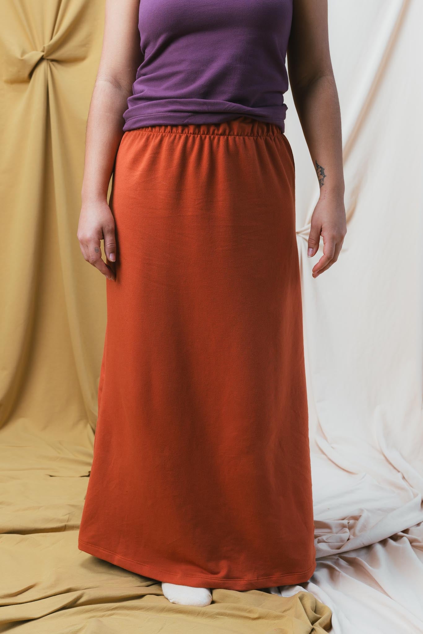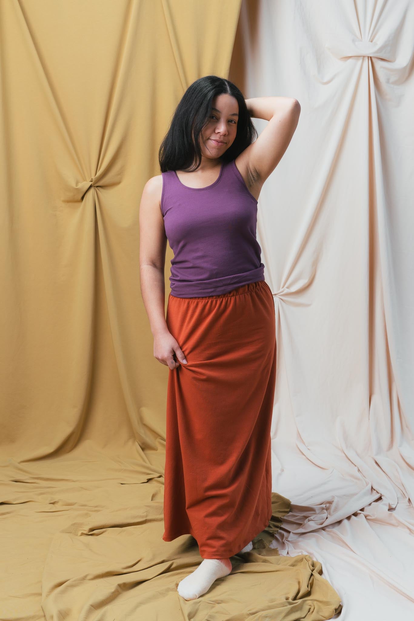 The Lounge Maxi Skirt is both flattering and simple, this skirt is a fantastic way to lounge or it can be dressed up and taken out for dinner or work. It travels well, and looks great with our crop tees and cardigans.
