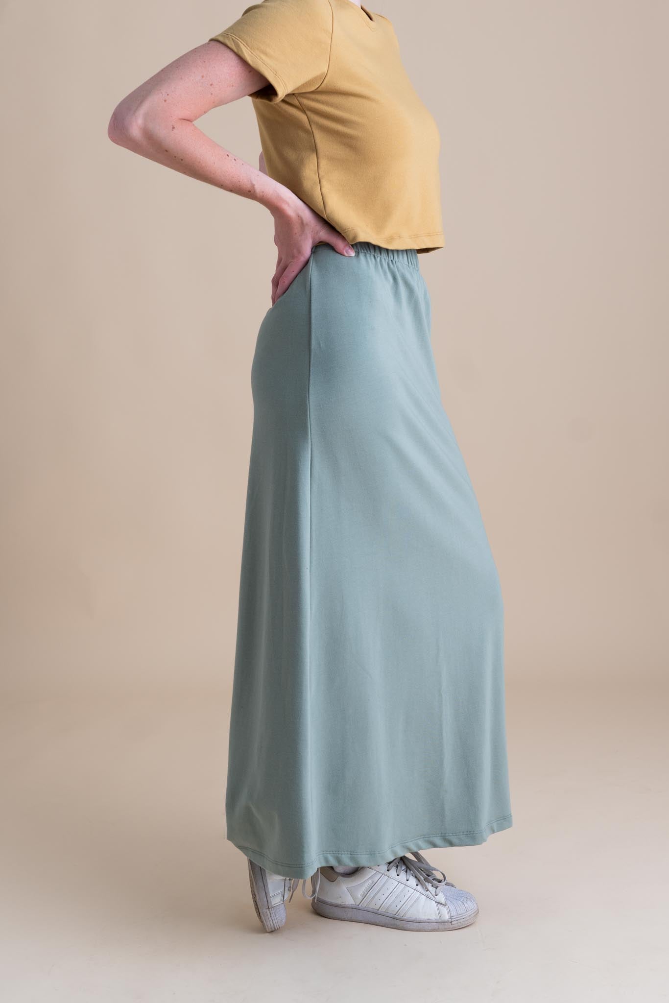 The Lounge Maxi Skirt is both flattering and simple, this skirt is a fantastic way to lounge or it can be dressed up and taken out for dinner or work. It travels well, and looks great with our crop tees and cardigans.