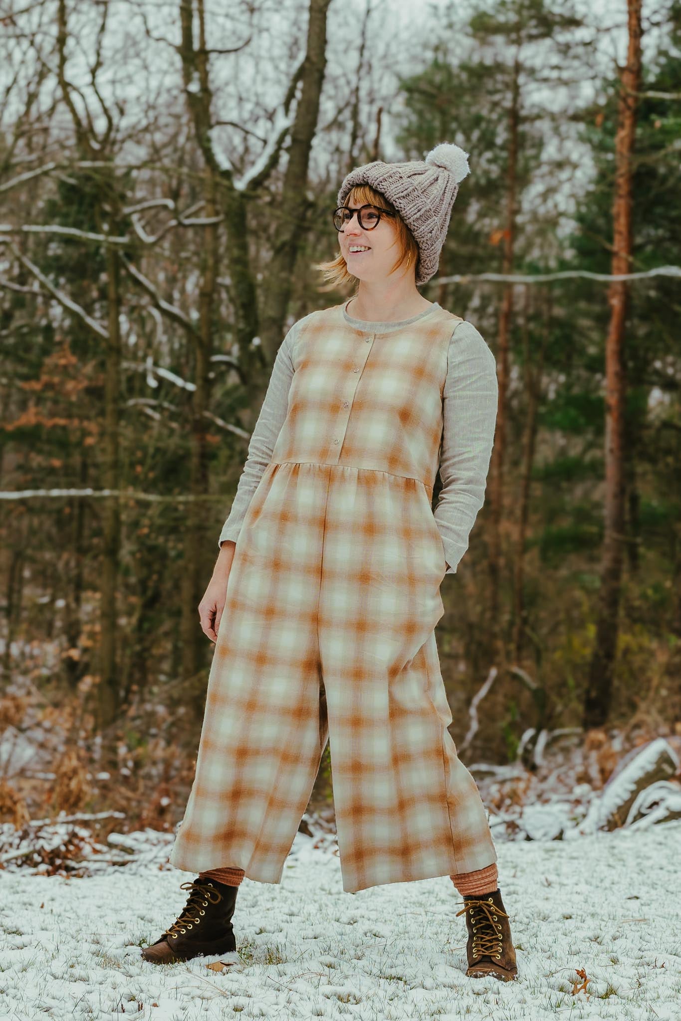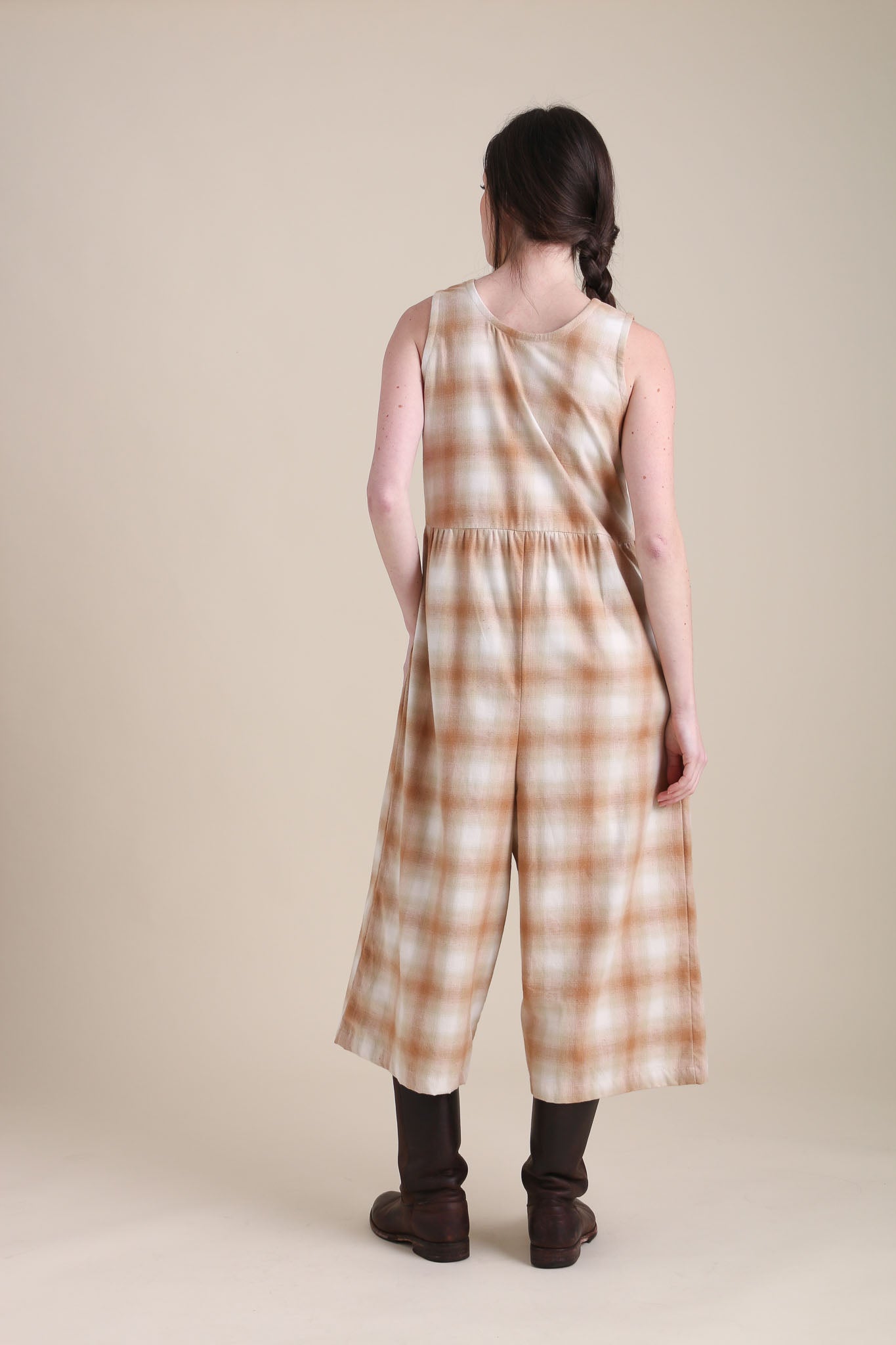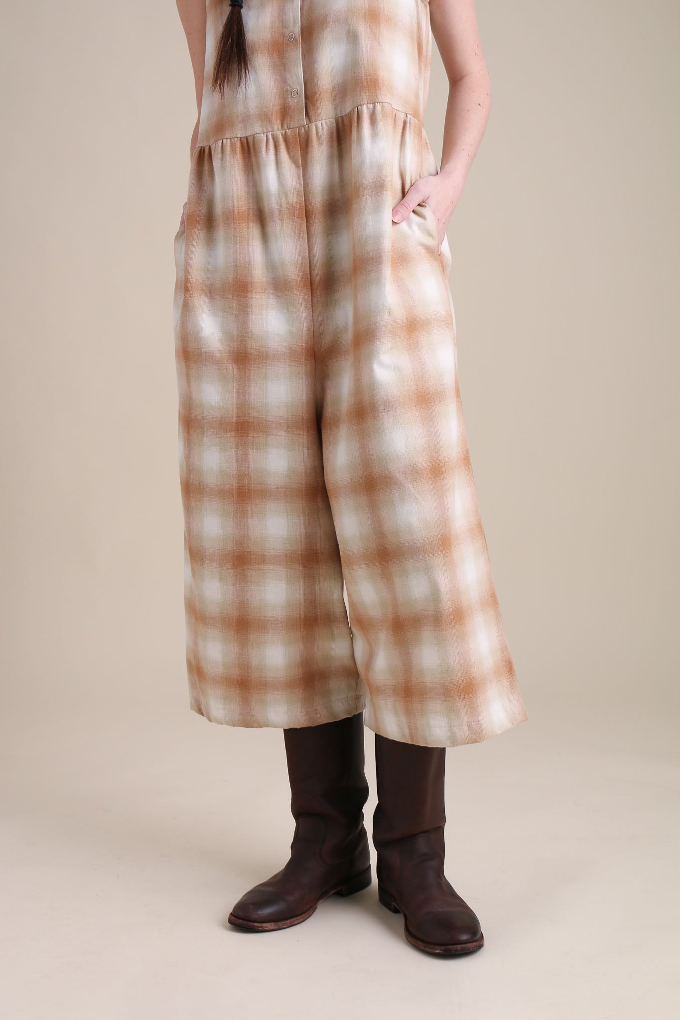 Flowing cropped pants give the Backyard Jumpsuit all the comfort you could want with the simplicity of a one-piece. Featuring inside pockets and snaps that can be worn front or back. Flannel like texture, medium weight brushed cotton that drapes beautifully.