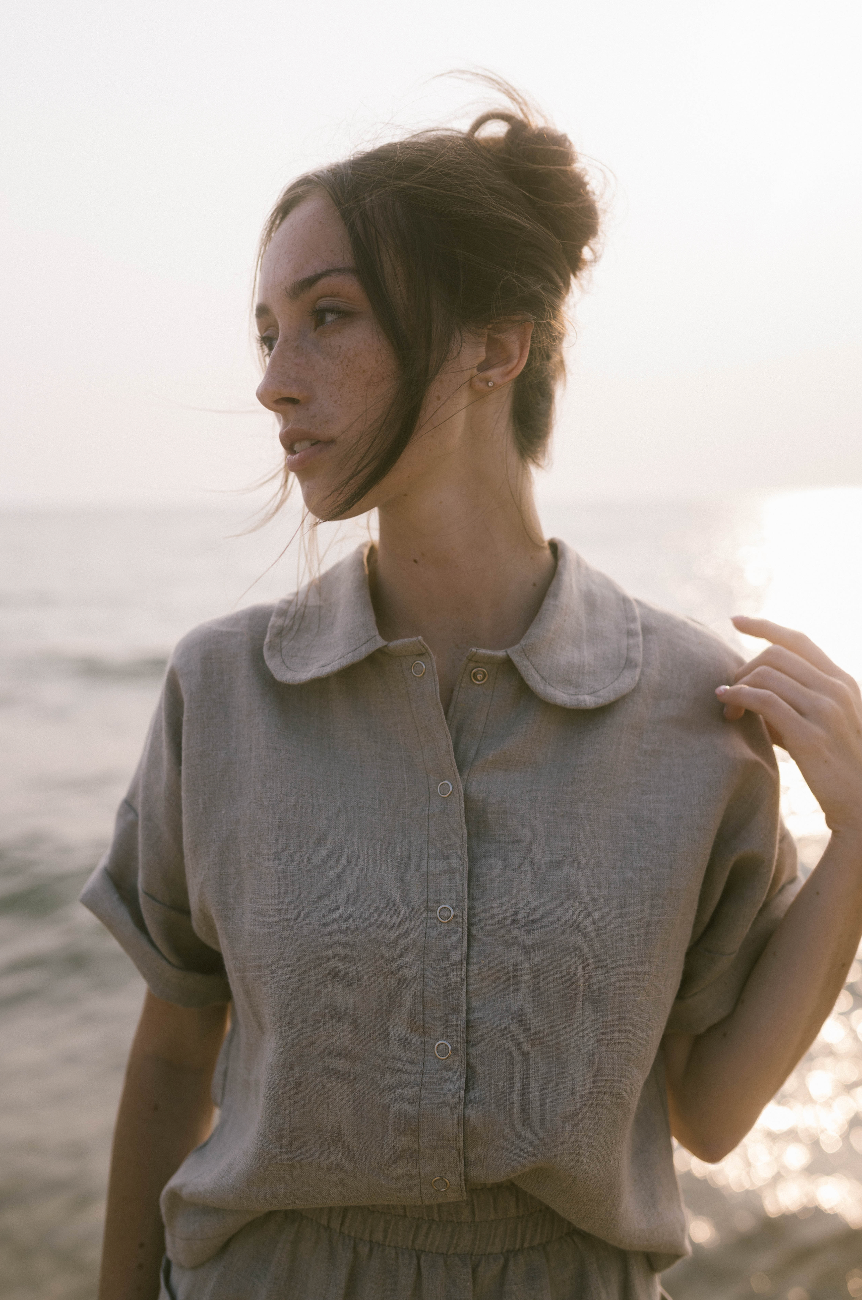 100% Linen Ruthie Top – Versatile Layering Piece with Soft Rounded Collar