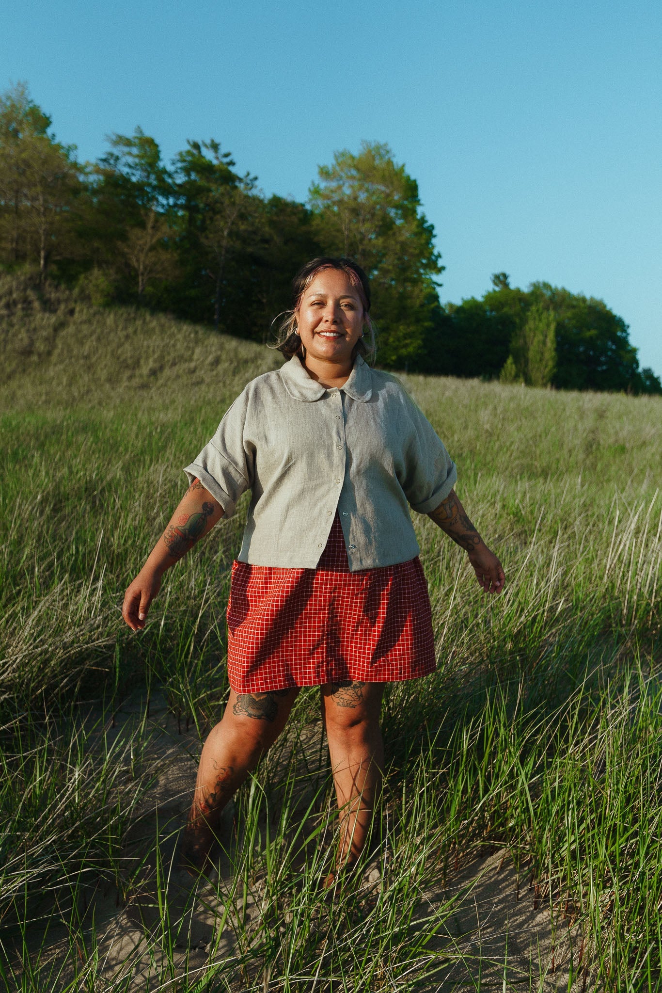 Made from 100% Linen, the Ruthie Top is a versatile wardrobe essential. Wear it layered under or over other pieces, or snap it up and pair with high-waisted pants for a sleek look. The boxy shape and soft rounded collar offer a modern, flattering silhouette, making it a timeless style tribute to the legendary RBG.