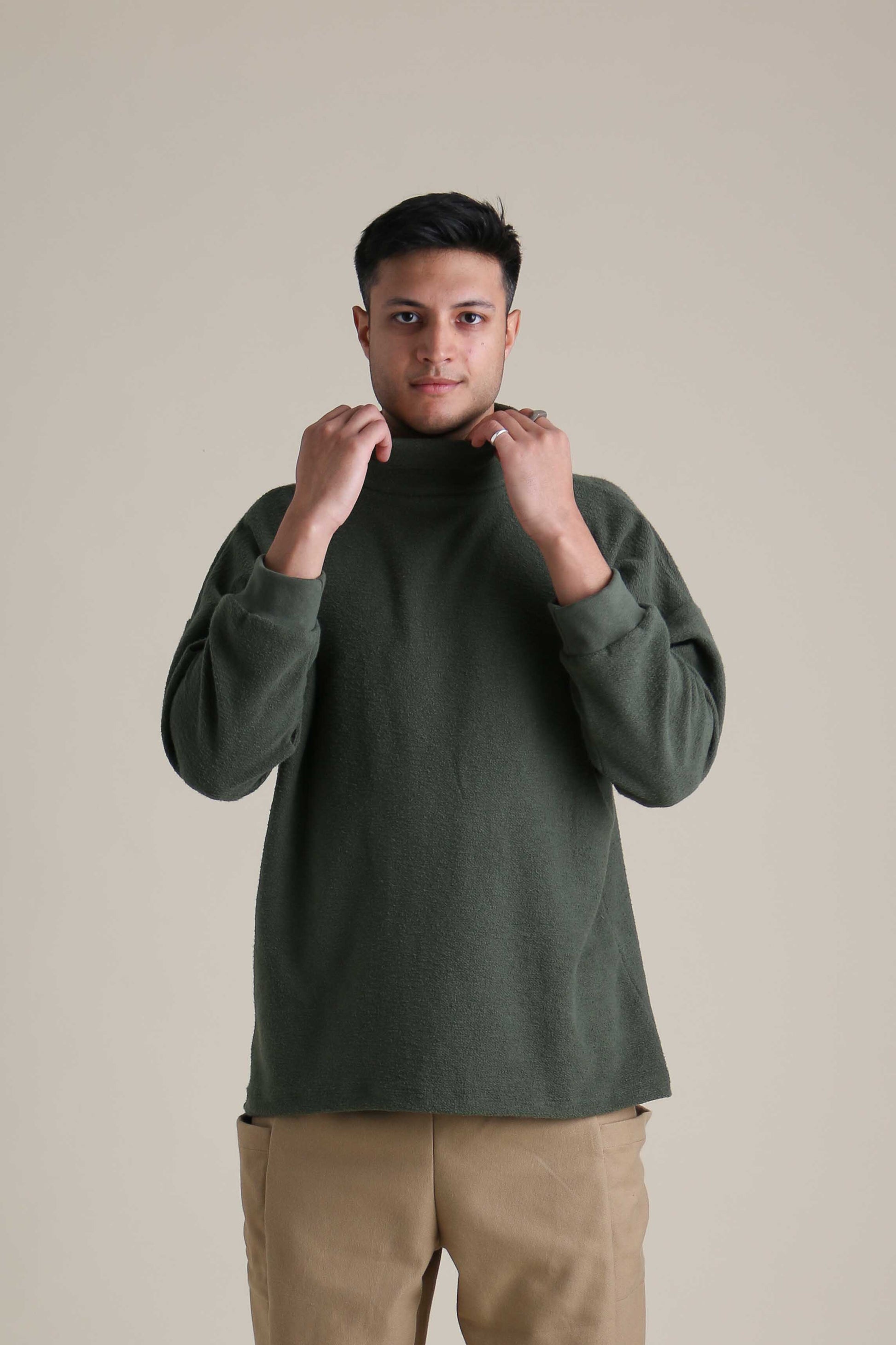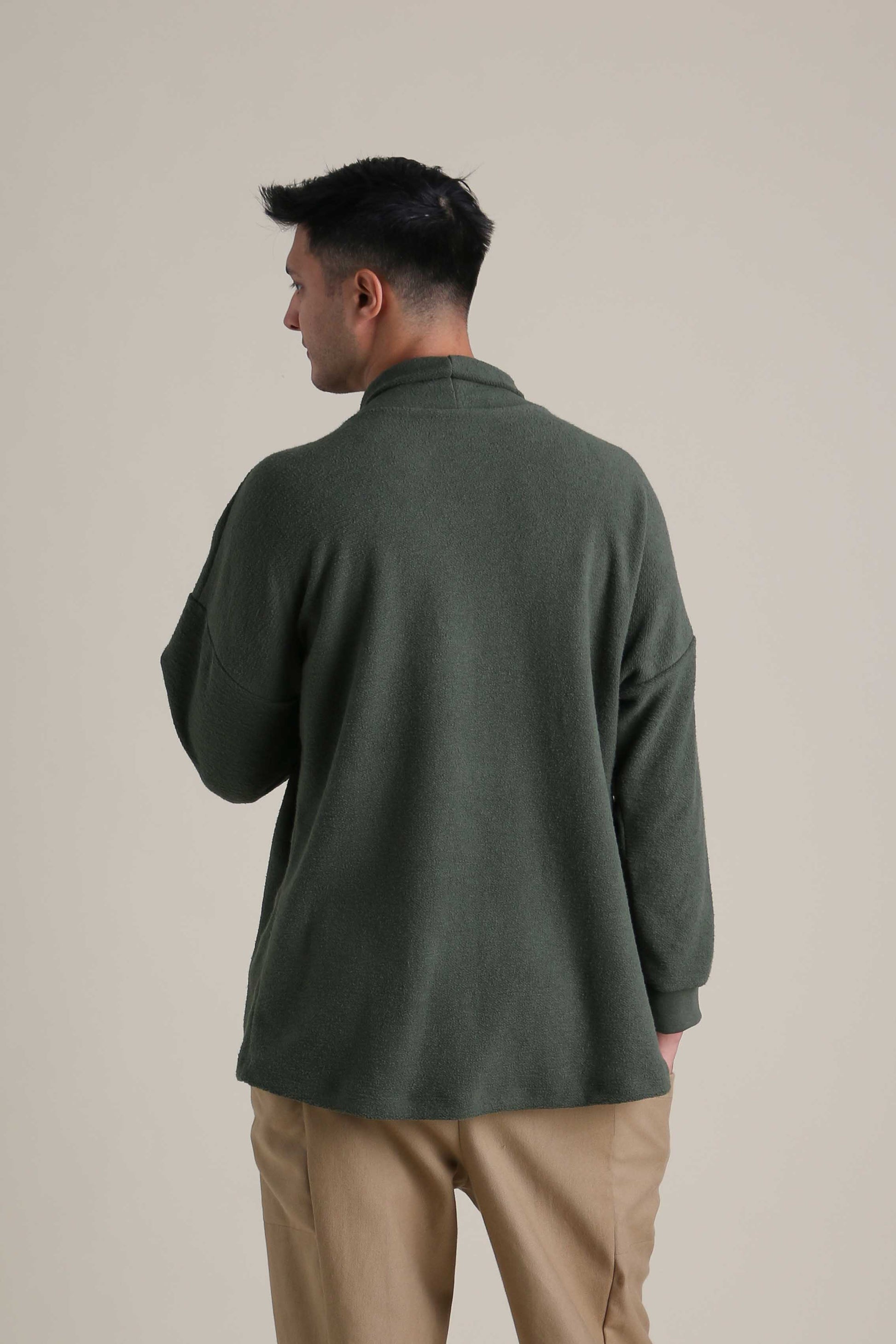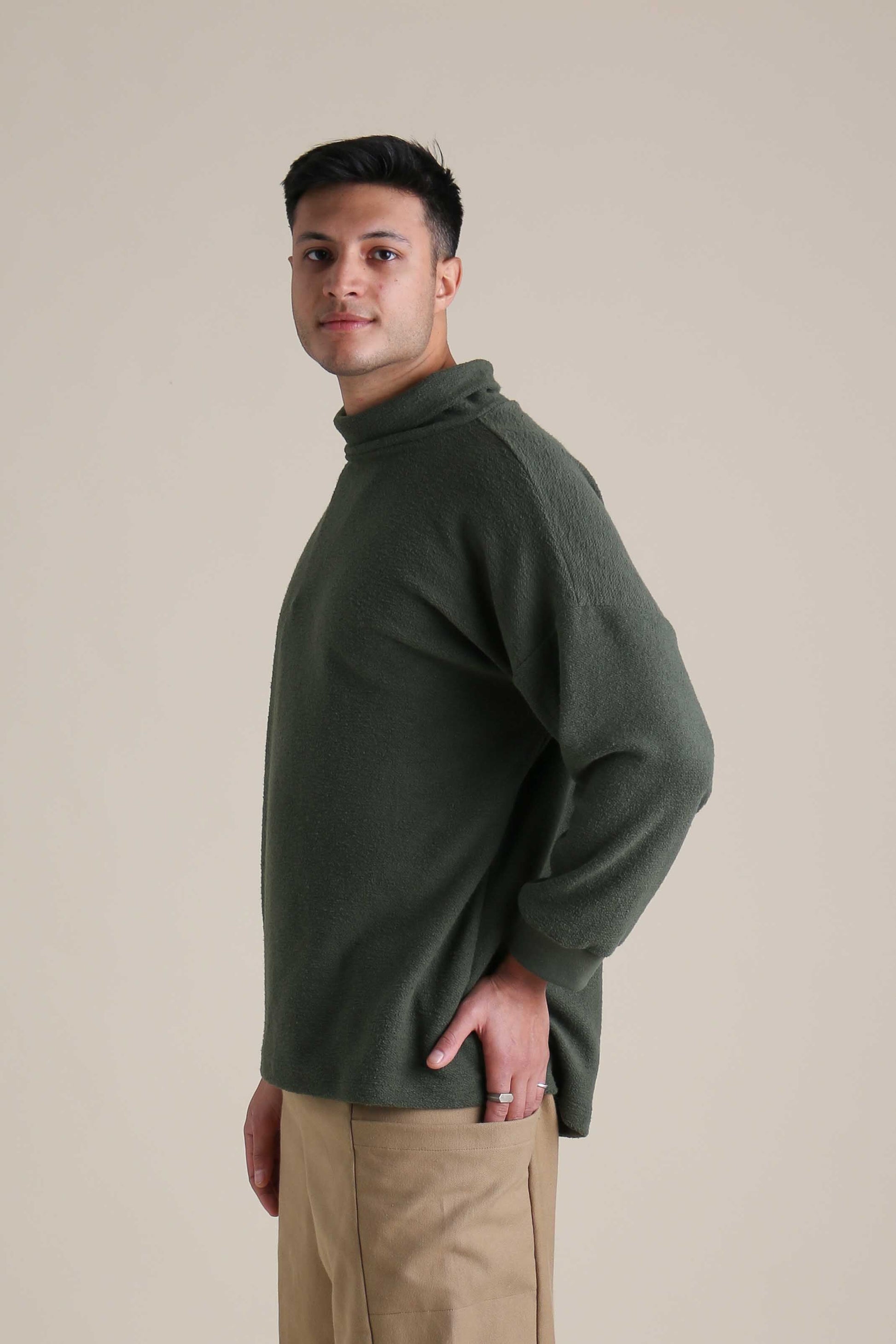 The Traveler Tunic was designed with different bodies in mind. The bottom hem is curved, featuring a longer back panel to keep the torso cozy and completely covered. Sewn with the fuzzy side out, we love how the texture looks and feels. 55/45 hemp and organic cotton knit. Free of polyester, plastic and synthetic fibers.